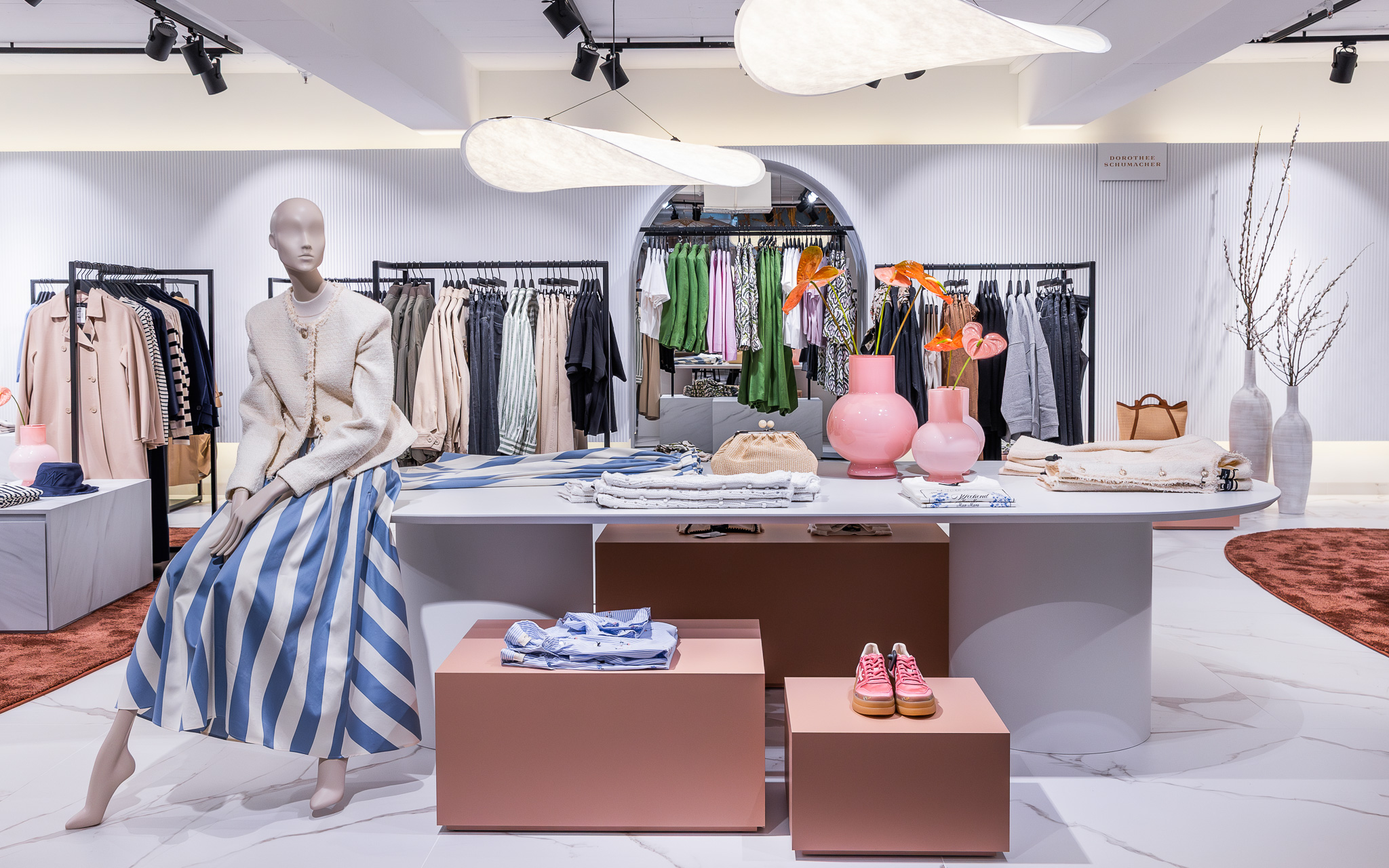 The corrugated sheet metal rear walls deliberately set industrial accents, which are picked up on by the clear furniture design. An eye-catching light installation made of linear LED rods breaks through the room axis and gives the center an almost scenographic quality. This is where fashionable function meets a visually strong spatial concept.